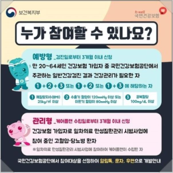 고혈압, 당뇨, 비만을 앓고 있는 대상 중 예방형과 관리형으로 나뉩니다. 예방형은 환자는가 아닌 질병에 대한 예방을 위한 것이고 관리형은 이미 환자로 지정된 대상입니다.