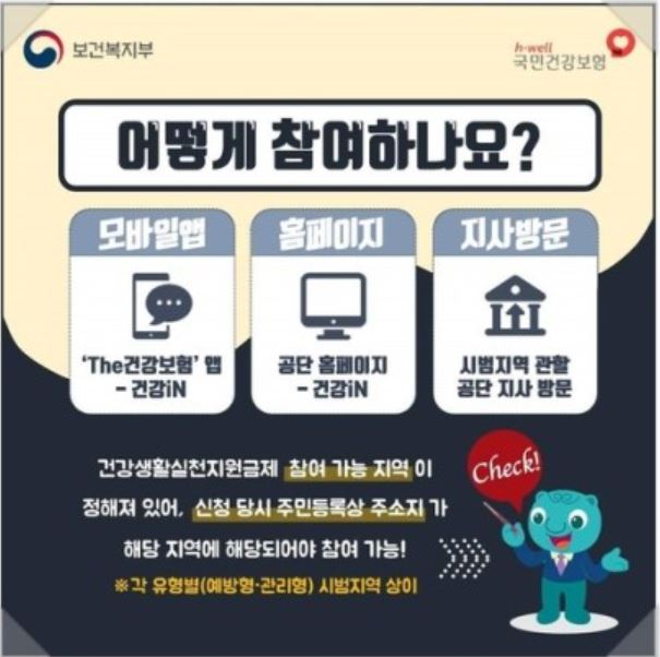 여타 정부 지원금과 달리 소득 수준 등 별다른 조건은 상관이 없습니다. 일반 건강검진을 실시하면 건강보험 가입자는 고혈압, 당뇨 위험이 있으면 시범지역의 대상자에게 우편이나 문자 안내가 됩니다.