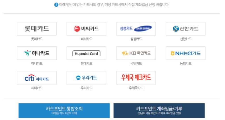 ** 참고사항 : 카드 포인트 통합조회・계좌 입금 서비스는 외국인을 포함한 신용 카드사 등의 개인회원이면 누구나 이용할 수 있지만 법인회원(공용)은 불가하니 유의하세요!