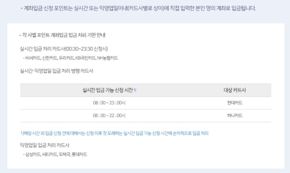 📌 카드포인트 통합조회 서비스 시간 : 매일 00:30~23:30 (카드사별 1일 1회만 계좌 입금 신청이 가능)