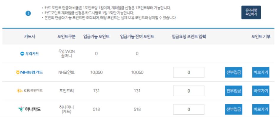 | 여신금융협회 카드포인트 통합조회 - 계좌 입금 신청 가능 포인트 리스트 |