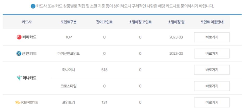 일단 얼마 있는지 궁금해서 카드포인트 통합조회를 진행했습니다! 저의 신용카드 포인트 내역입니다!