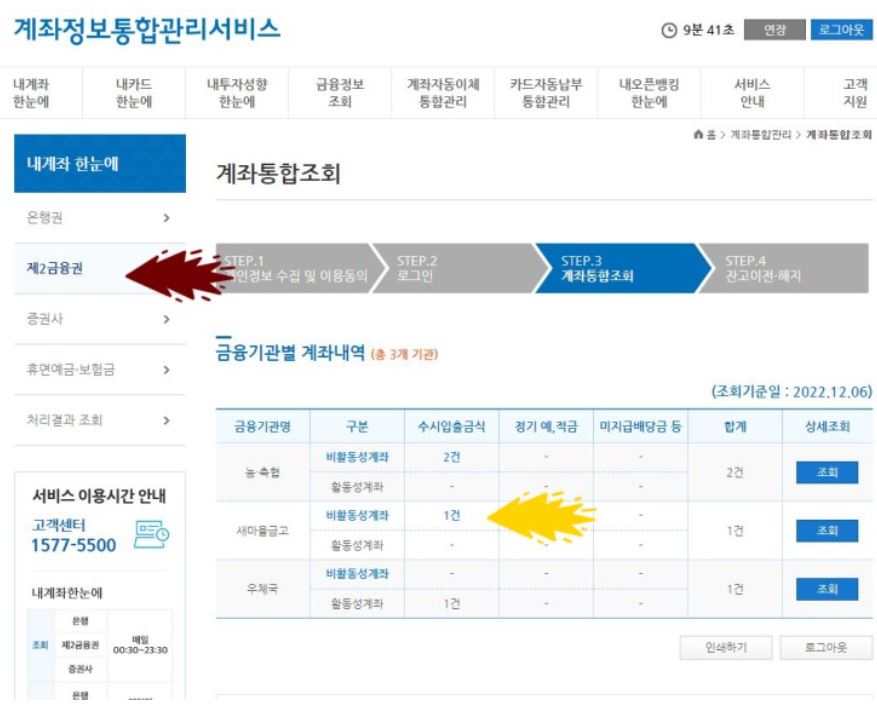 은행권, 제2금융원 , 증권사, 각각 조회가 됩니다. 이때 비활동성계좌 옆에 숫자가 있다면 상세조회 선택하시면 됩니다.