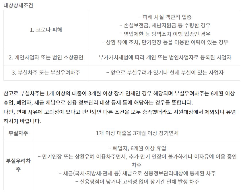 코로나 피해로 대출상환에 어려움을 겪고 있는 소상공인 및 자영업자를 위한 프로그램입니다. 개인사업자 또는 법인 소상공인으로서 부실차주/ 부실우려차주 에 해당될 경우 신청 가능합니다.