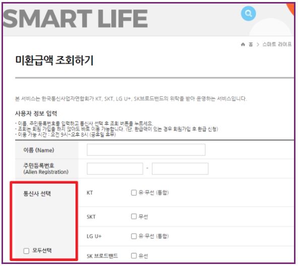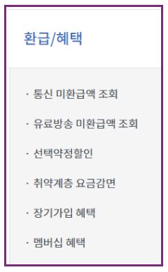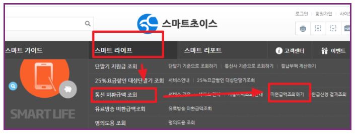 2.메뉴 - 스마트라이프 - 통신 미환급액 조회 - 미환급액조회하기