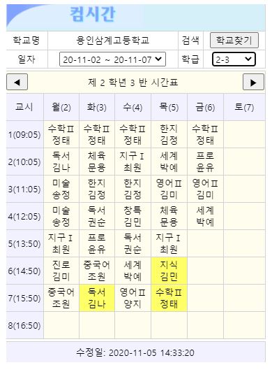 학교 전산 시스템에 설치되어 있는 학내망을 이용해서 선생님이 시간표를 수정하게 되면 학생들이 PC나 핸드폰을 통해 컴시간 알리미를 이용하여 변경된 시간표를 바로 확인할 수 있습니다. 부모님들도 아이들의 바뀐 시간표를 확인하시는데 정말 편리합니다.