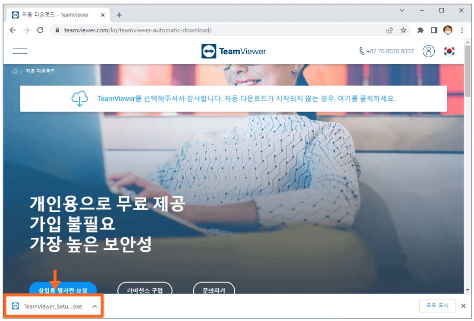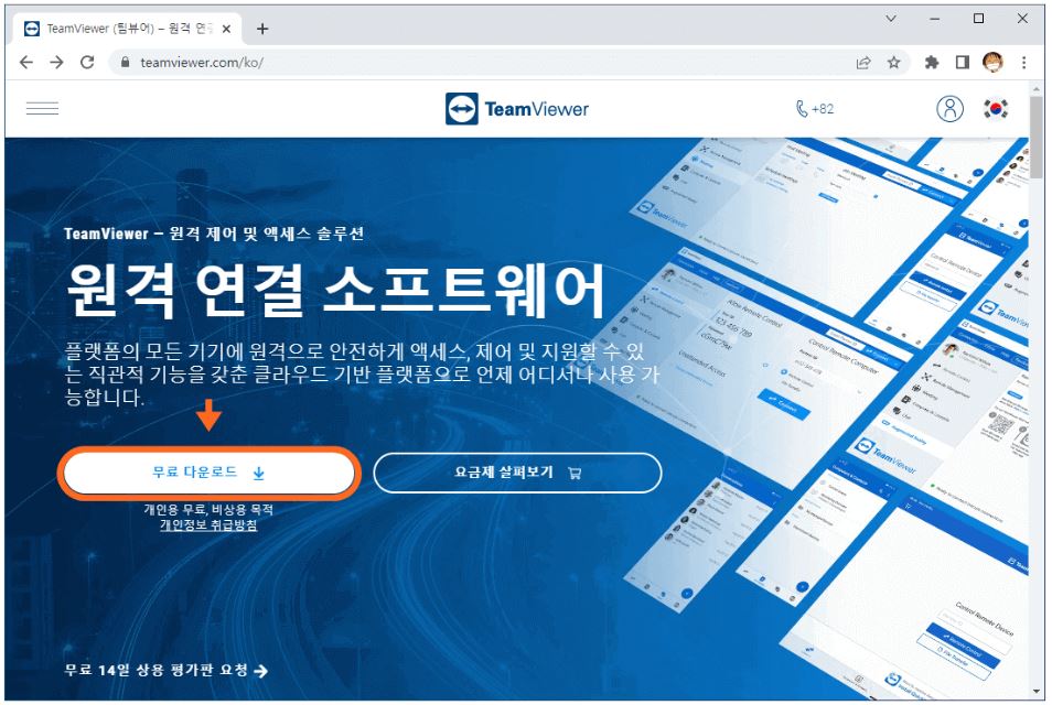 1. 팀뷰어 공식 홈페이지에 접속을 하셨다면 사이트 중간의 두 개의 버튼 중에서 왼쪽에 있는 '무료 다운로드' 버튼을 선택하시면, 팀뷰어를 설치하실 수 있는 파일이 설치되게 됩니다.