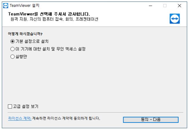 그러면 아래의 사진처럼 팀뷰어 설치 프로그램창이 나타납니다. 아래쪽에 위치하고 있는 '라이선스 계약'을 읽으신 후에 어떤 식으로 설치를 하실 건지 선택을 하시고 '동의-다음'버튼을 통해서 팀뷰어 무료 다운로드를 마치시면 됩니다. 저는 기본 설정으로 설치하겠습니다.