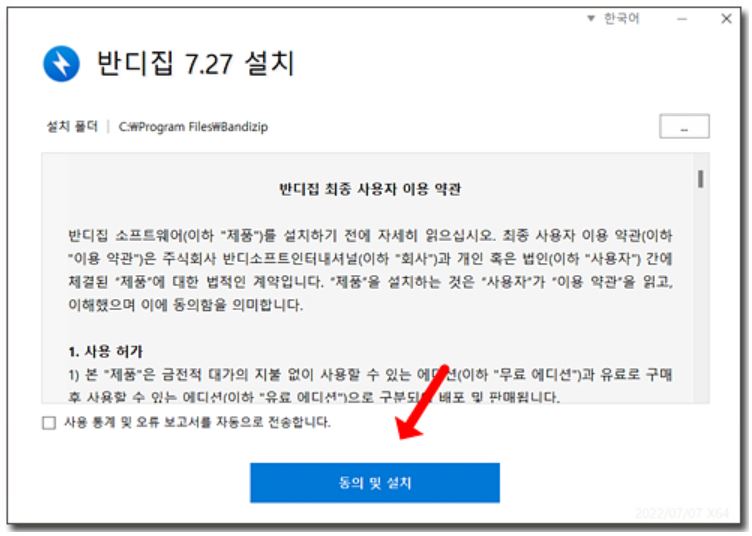 반디집 설치창이 나오면 "동의 및 설치" 아이콘을 눌러주세요. 바로 설치가 시작되고 설치가 완료되면 닫기 아이콘을 클릭해 주세요.
