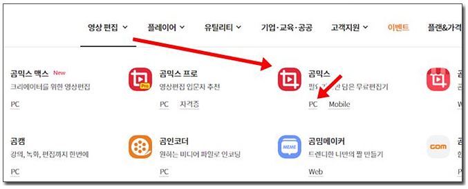 곰앤컴퍼니는 곰믹스 이외에도 곰플레이어, 곰스튜디오 등 다양한 소프트웨어를 제공 및 판매하고 있습니다. 하지만 어떤 페이지로 들어왔다 하더라도 상단 메뉴에서 영상 편집을 누른 후에 곰믹스 항목에서 작게 적힌 PC라는 글자를 누르면 곰믹스 다운로드 페이지로 연결됩니다.