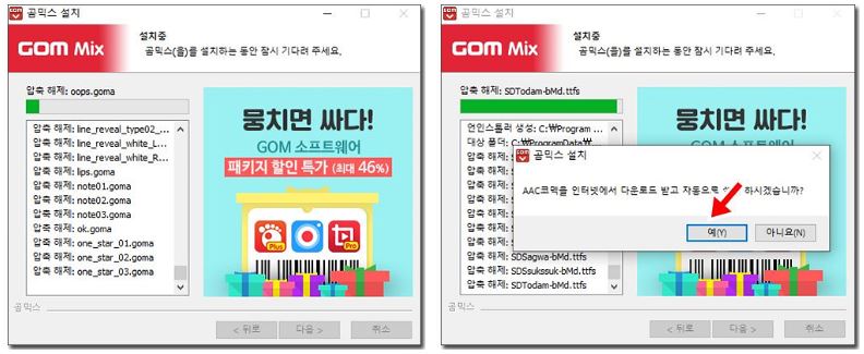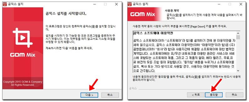 곰믹스 설치파일을 실행하면 설치파일을 로딩한 후에 곰믹스 설치 팝업이 나오는데 다음 버튼을 누르면 됩니다. 이후 사용권 계약 팝업이 나오면 동의함 버튼을 눌러 설치를 진행합니다.