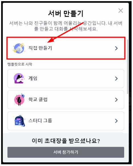 - 서버 만들기 탭에서 직접 만들기를 선택합니다.
