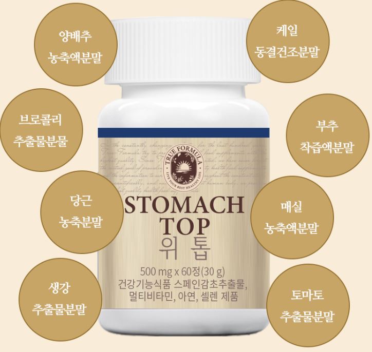 트루포뮬러 위톱에는 다양한 부원료들이 함유되어 있습니다. 위에 좋은 대표적인 음식인 양배추부터 브로콜리, 매실, 생강 등등 위건강에 좋은 부원료들이 다양하게 함유되어 있습니다.