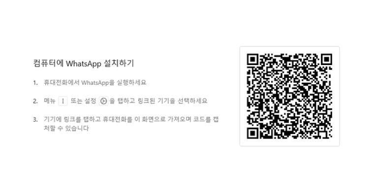 컴퓨터에 WhatsApp 설치하기 창이 나오고 QR코드가 나타납니다. 이 화면을 그대로 두고 스마트폰을 열어 왓츠앱을 실행하여 주세요.