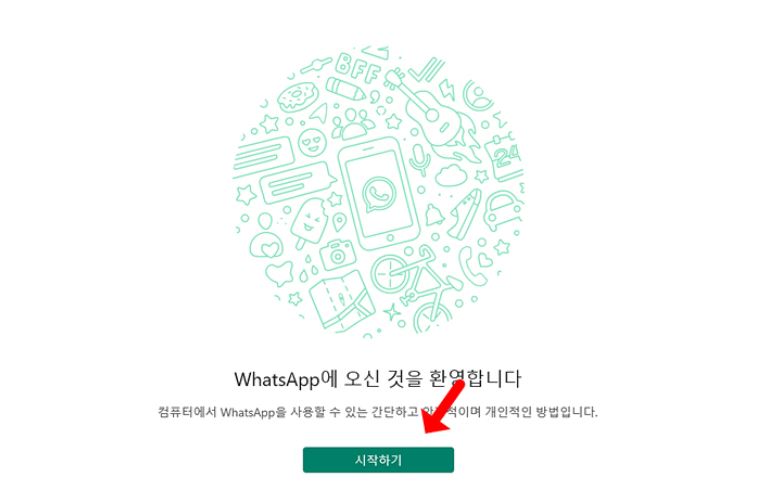 왓츠앱 실행창이 나타나면 시작하기를 눌러주세요.