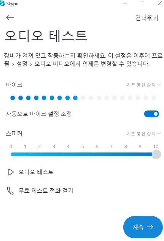 마이크나 스피커 자체의 문제이거나 와이파이 불안정 사전 확인해주세요. 그뒤 비디오 테스트도 하시면 됩니다 이상 스카이프 skype 설치 완료입니다!!