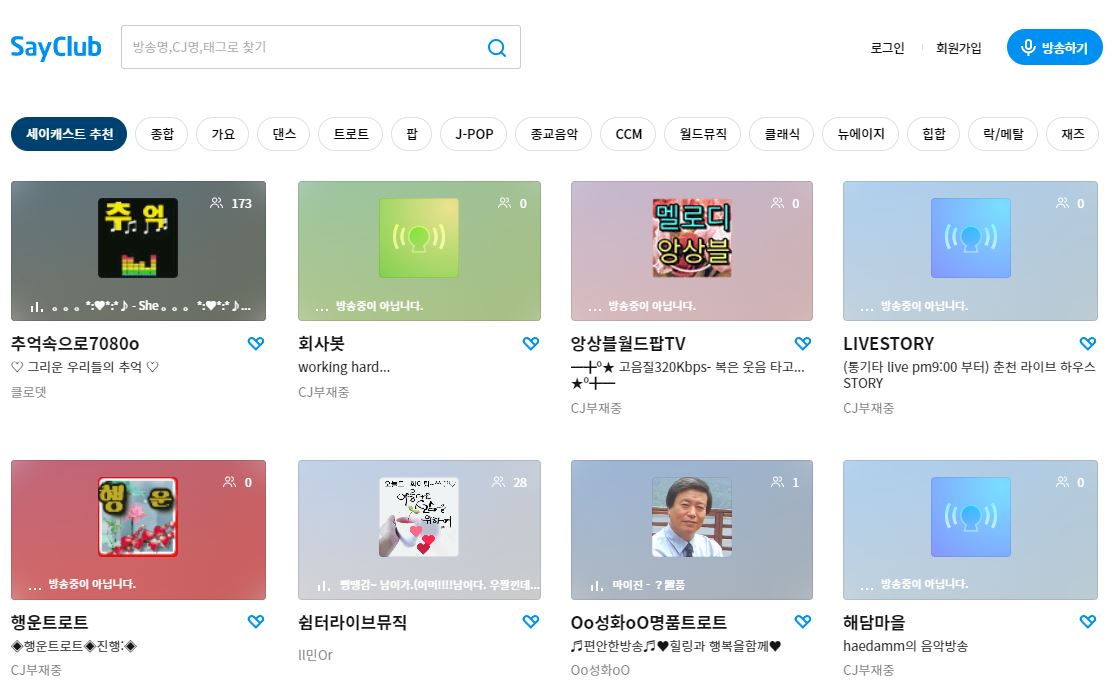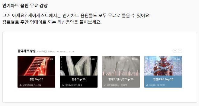 세이클럽 플랫폼을 통해 액세스 할 수 있는 인터넷 라디오 방송시스템인 세이캐스트는 하루 24시간 다양항 음악을 제공합니다. 전액 무료로 제공되는 이 서비스는 국내 인터넷 라디오 방송의 선두주자로 자리 잡았습니다.