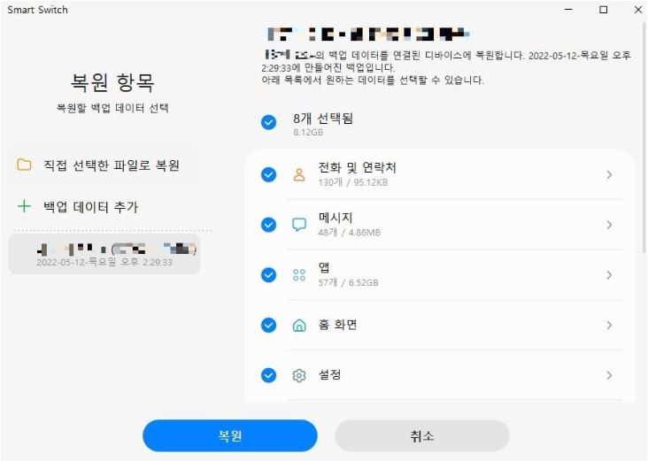 복원도 간단합니다. 삼성 스마트스위치 PC버전으로 백업을 한 상태라면, PC와 스마트폰을 연결하고, 복원을 클릭하고 최근에 백업한 항목을 클릭해서 복원을 클릭하면 됩니다. 복원은 해보지 않았지만 백업과 마찬가지로 데이터량에 따라 소요되는 시간이 다릅니다.