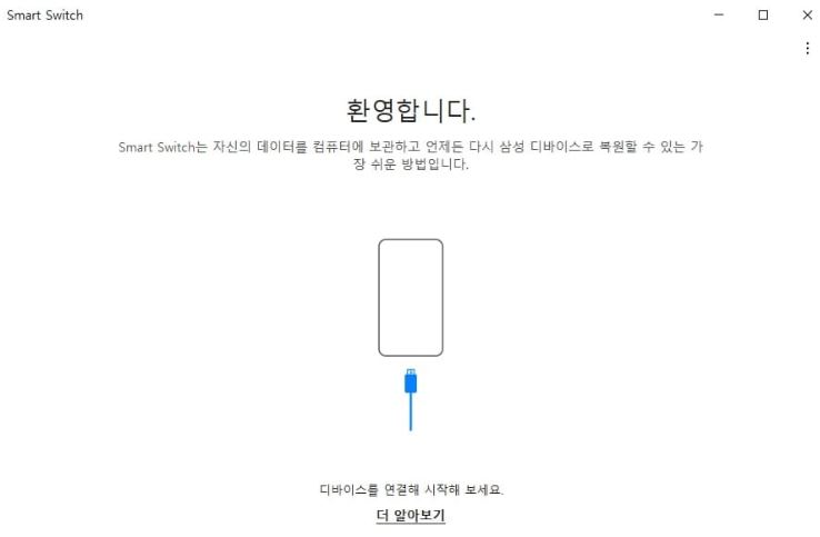 설치 완료되고, 실행하면 디바이스와 연결하라고 합니다. 케이블로 스마트폰과 PC를 연결해주시면 됩니다. 만약 케이블로 연결했는데, 충전만 된다면 해당 케이블이 데이터 전송용이 아닐 수도 있습니다.