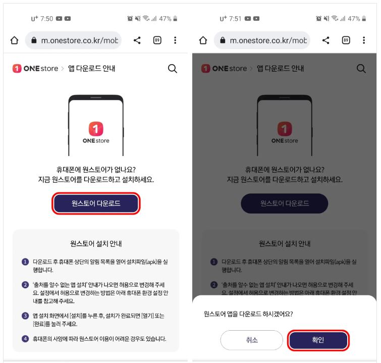 4. "원스토어 앱을 다운로드 하시겠어요?"라는 메시지가 뜨면 "확인" 버튼을 누릅니다.