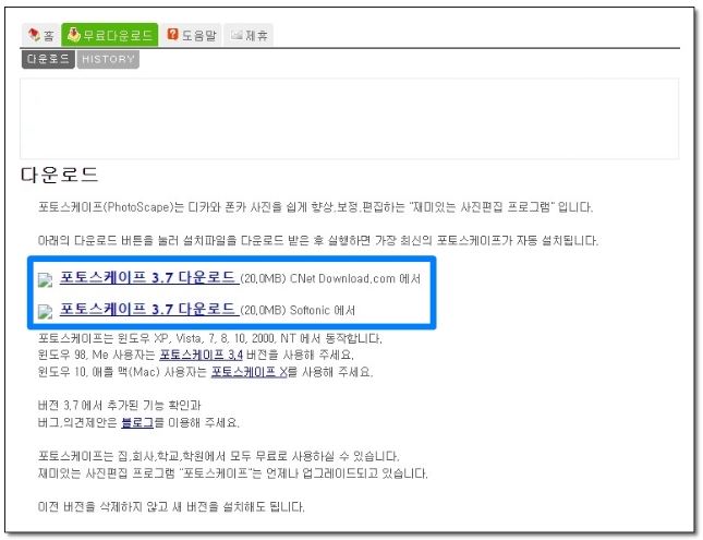 포토스케이프 3.7은 CNet, Softonic을 통해서 배포가 이루어 지고 있습니다. 둘 중 아무 링크나 누르시면 됩니다.