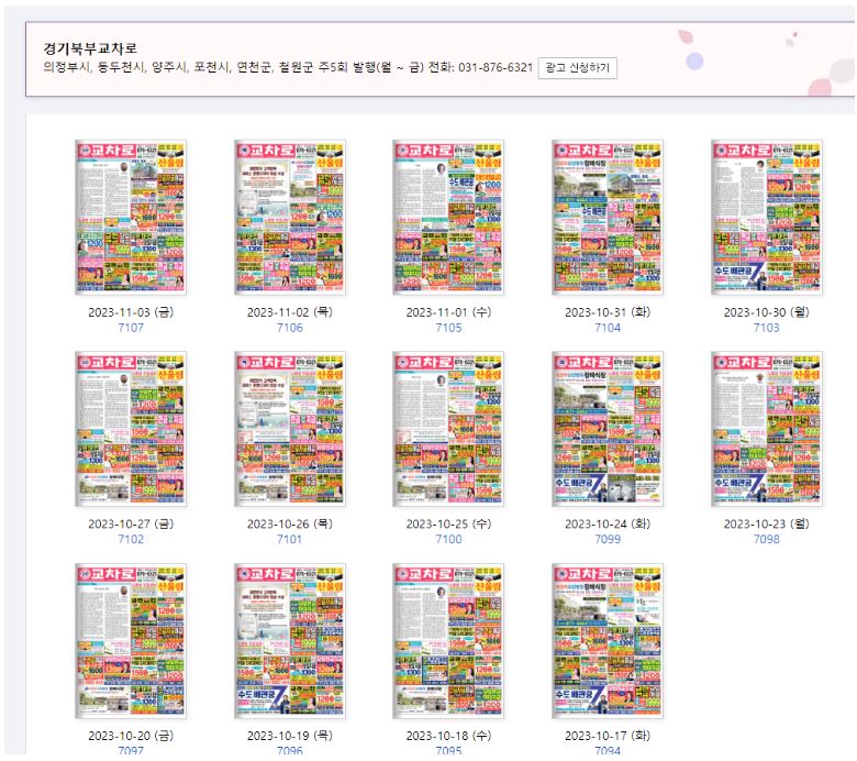 신문그대로보기를 원하는 교차로를 클릭합니다. 최근 2주의 신문을 그대로 볼 수 있습니다.