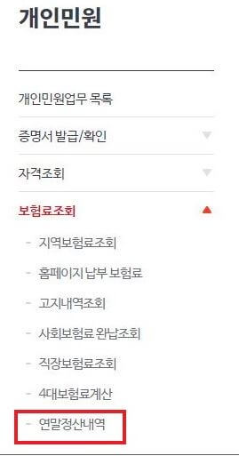 ▶ 방문자별 맞춤 메뉴에서 건강 보험 환급금, 조회/신청 메뉴를 클릭해 주세요. 연말정산내역을 클릭해주세요.