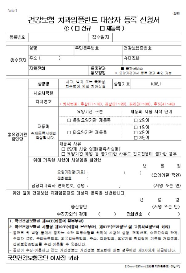 - 요양기관이 확인한 "건강보험 치과 임플란트 대상자 등록신청서"를 공단에 제출하여 등록 신청 가능